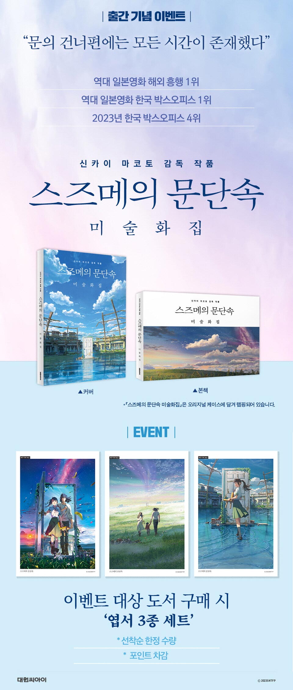 > 『스즈메의 문단속 미술화집』출간 기념 이벤트 - 엽서 세트 증정 (2024.02.23 ~ 2200.12.31)