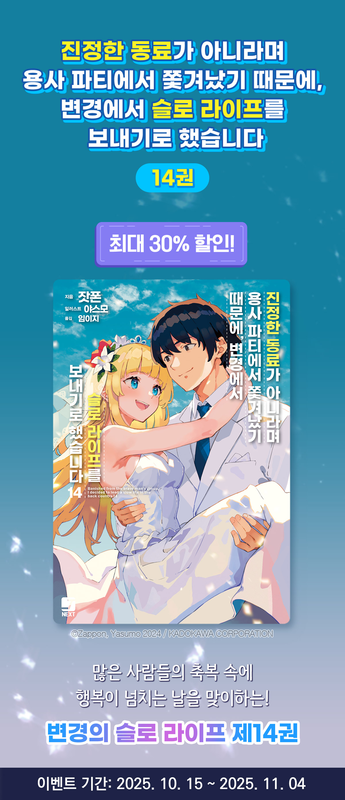 > [라노벨] 제이노블 넥스트 『진정한 동료가 아니라며 용사 파티에서 쫓겨났기~』 14권 UP! (2025.10.15 ~ 2025.11.04)