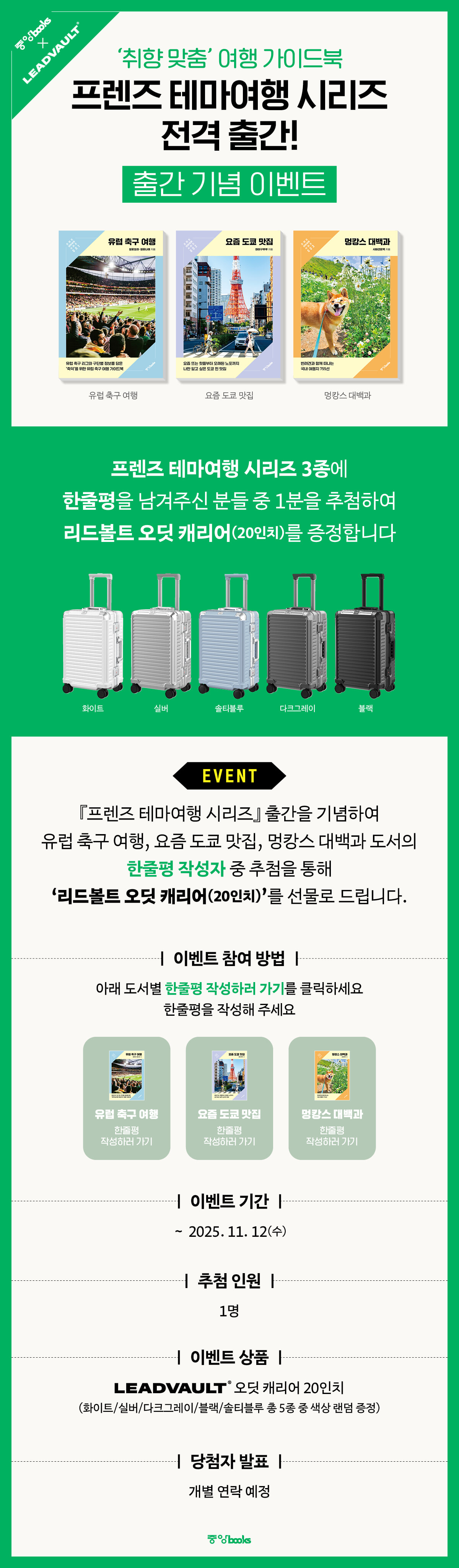 > 『유럽 축구 여행』, 『요즘 도쿄 맛집』, 『멍캉스 대백과』 한줄평 이벤트 (2025.10.28 ~ 2025.11.12)
