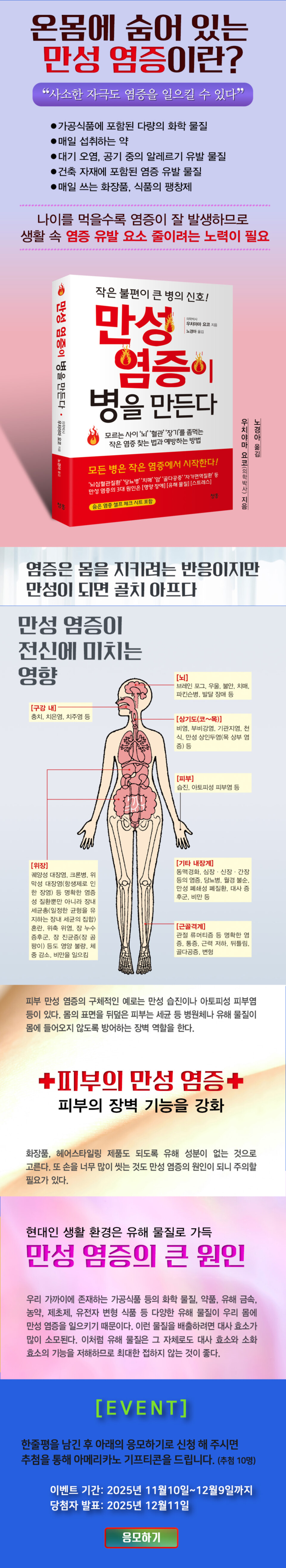 > 아메리카노 기프티콘 추첨! 『만성 염증이 병을 만든다』 한줄평 이벤트 (2025.11.10 ~ 2025.12.09)
