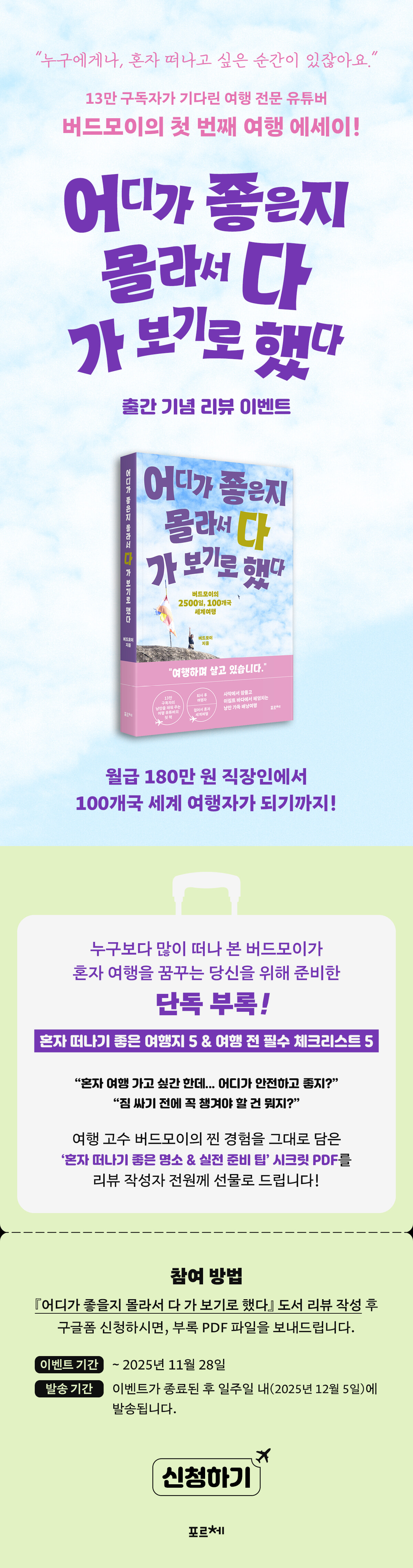 > 시크릿 부록 PDF 파일 증정! 『어디가 좋은지 몰라서 다 가 보기로 했다』 리뷰 이벤트 (2025.11.13 ~ 2025.11.28)