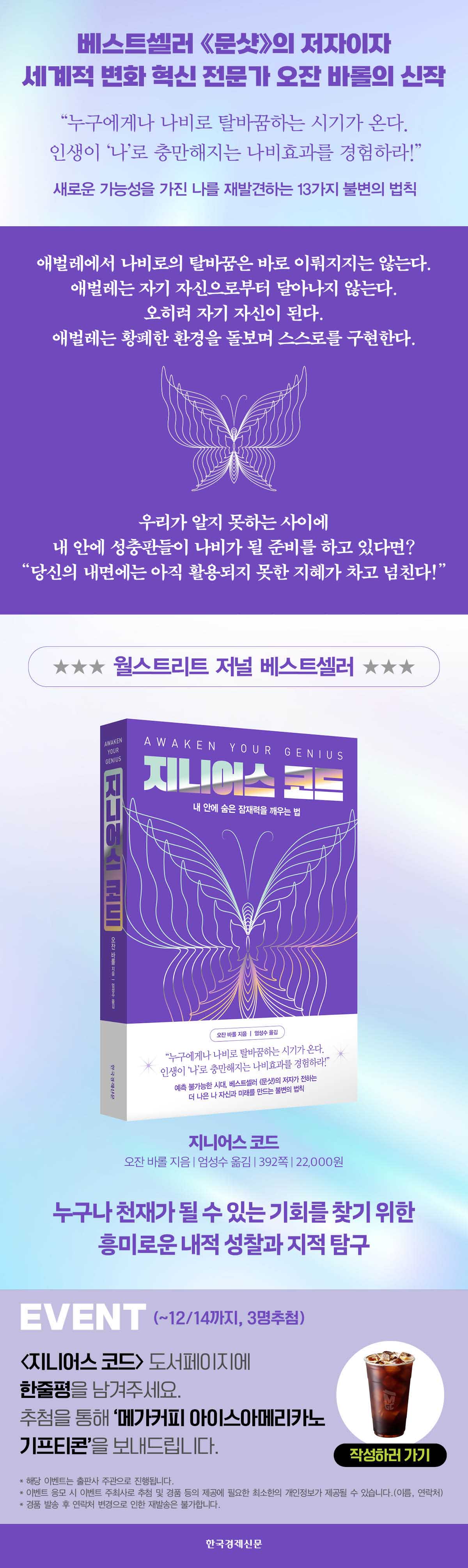 > 아이스 아메리카노 기프티콘 추첨! 『지니어스 코드』 한줄평 이벤트 (2025.11.18 ~ 2025.12.14)