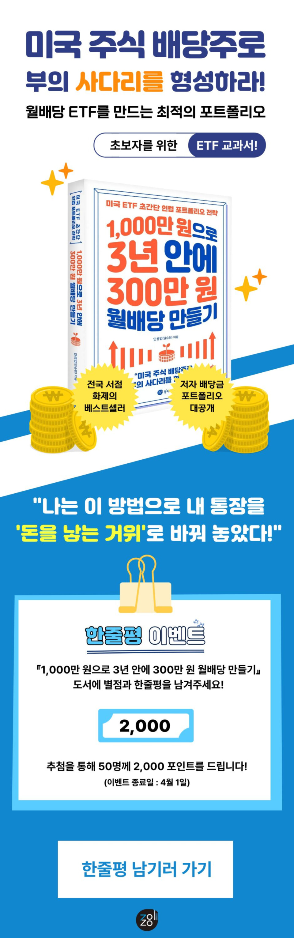 > [단독] 『1,000만 원으로 3년 안에 300만 원 월배당 만들기』 한줄평 이벤트 (2026.03.03 ~ 2026.04.01)