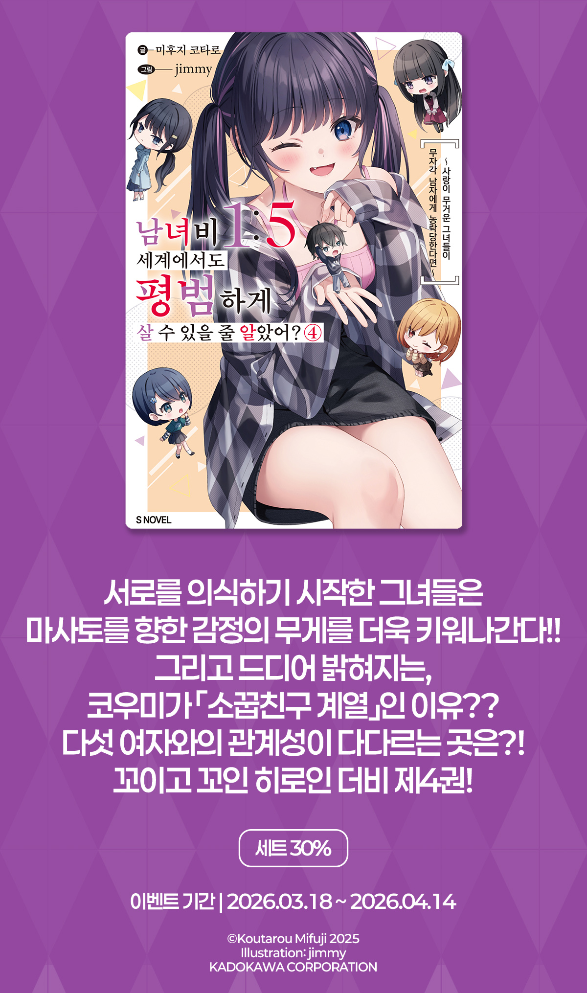 > [라노벨] S노벨 플러스 『남녀비 1:5 세계에서도 평범하게 살 수 있을 줄 알았어?』 4권 UP! (2026.03.18 ~ 2026.04.14)
