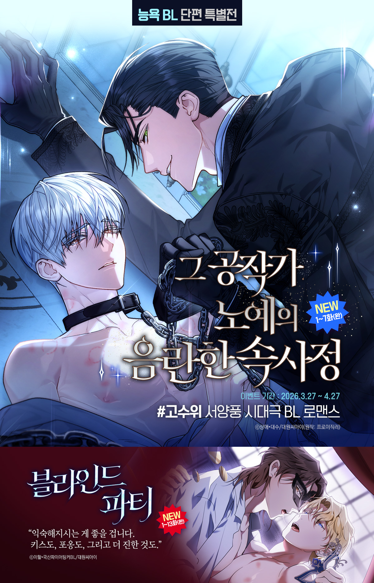 > [BL만화] 대원씨아이 『그 공작가 노예의 음란한 속사정』, 『블라인드 파티』 론칭! (2026.03.27 ~ 2026.04.27)