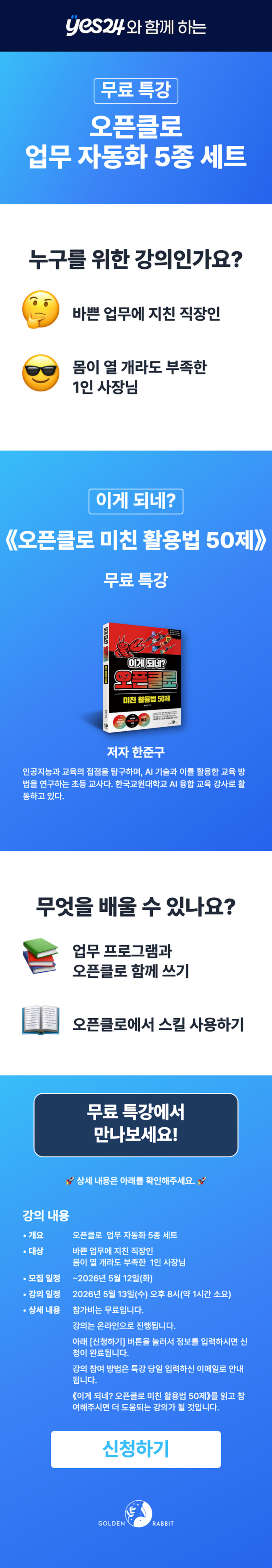 대표 : 김석환, 최세라 주소 : 서울시 영등포구 은행로 11, 5층~6층(여의도동,일신빌딩) 사업자등록번호 : 229-81-37000   통신판매업신고 : 제 2005-02682호 사업자 정보확인 이메일 : yes24help@yes24.com   호스팅 서비스사업자 : 예스이십사(주)