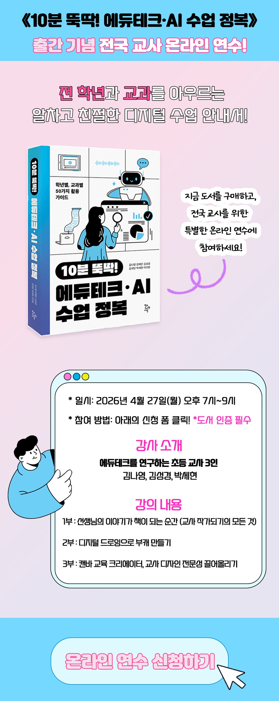 > 『10분 뚝딱! 에듀테크·AI 수업 정복』 출간 기념 전국 교사 온라인 연수 (2026.04.10 ~ 2026.04.24)