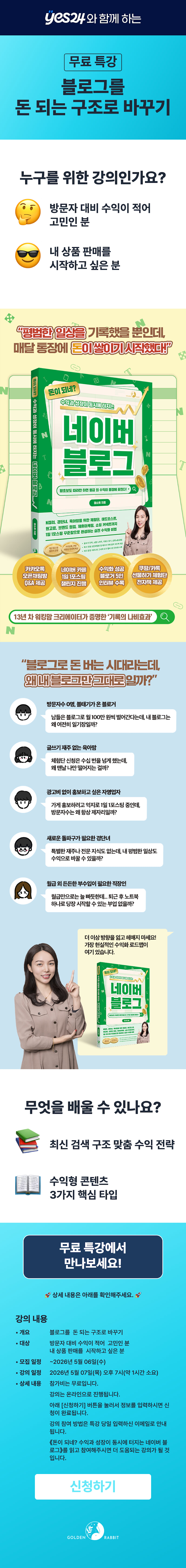 대표 : 김석환, 최세라 주소 : 서울시 영등포구 은행로 11, 5층~6층(여의도동,일신빌딩) 사업자등록번호 : 229-81-37000   통신판매업신고 : 제 2005-02682호 사업자 정보확인 이메일 : yes24help@yes24.com   호스팅 서비스사업자 : 예스이십사(주)