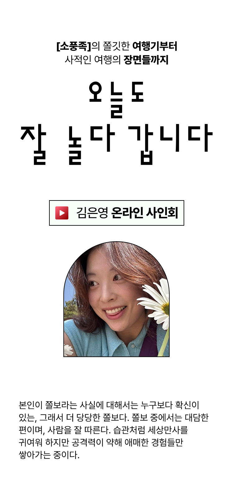 겁 많은 여행자 김은영 작가가 십년지기 [소풍족] 박서우와 떠난 여행 에피소드들과, 사적인 여행들에서의 경험과 감정들을 유쾌한 입담과 솔직함으로 풀어낸 책. 여행을 떠나기 전, 설렘과 불안이 뒤섞인 복잡한 마음을 경험해 본 사람이라면 완벽하지 않은 여행, 계획대로 되지 않는 여행의 솔직한 이야기가 담긴 저자의 이야기에 깊이 공감하게 될 것이다.