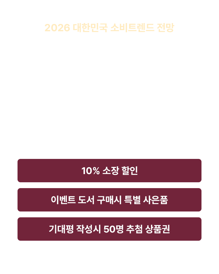 관세전쟁과 특이점을 향하는 AI의 위협, 끝이 보이지 않는 전쟁의 소용돌이 속에서도 한국 경제는 아직은 순항을 이어가고 있다. 자동차, 조선, 반도체에 이어 글로벌 시장에서 1위의 위업을 달성한 K뷰티, 더욱 한국적이 되어가는 K콘텐츠 열풍까지. 수많은 개인들이 보이는 역동적이고 창의적인 라이프스타일과 소비 행태들을 트렌드 코리아에서 만나보자.