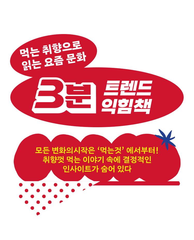 일상에서 먹는 것은 의식주 생활 중 무엇보다 기본적이고 중요한 가치를 지닌다. 『3분 트렌드 익힘책』은 우리 사회와 떼려야 뗄 수 없는 식문화를 톺아보고, 먹는 풍경에서 끌어낸 인사이트를 전한다. 소비자의 한 끼를 제대로 읽어내는 것이 곧 미래 시장을 정의하는 힘인 이유다. 이 책은 마케터와 기획자, 브랜드를 이끌어가는 이들에게는 당장 현업에 적용할 수 있는 생생한 인사이트를, 세상의 변화에 관심이 많은 이들에게는 오늘의 라이프스타일을 이해하는 가장 맛있는 단서를 건네줄 것이다.