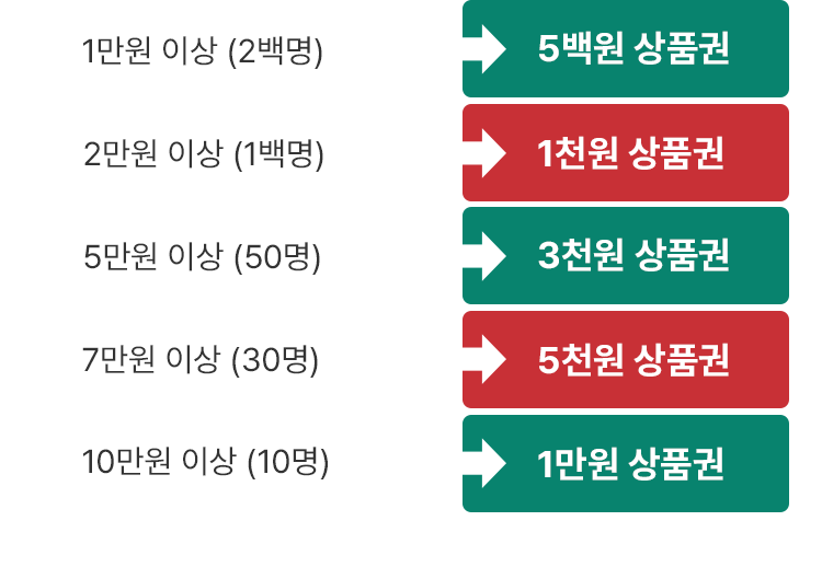상품권은 중복 지급되지 않으며, 구매금액 합산하여 가장 높은 금액 기준의 상품권으로 추첨 지급됩니다.