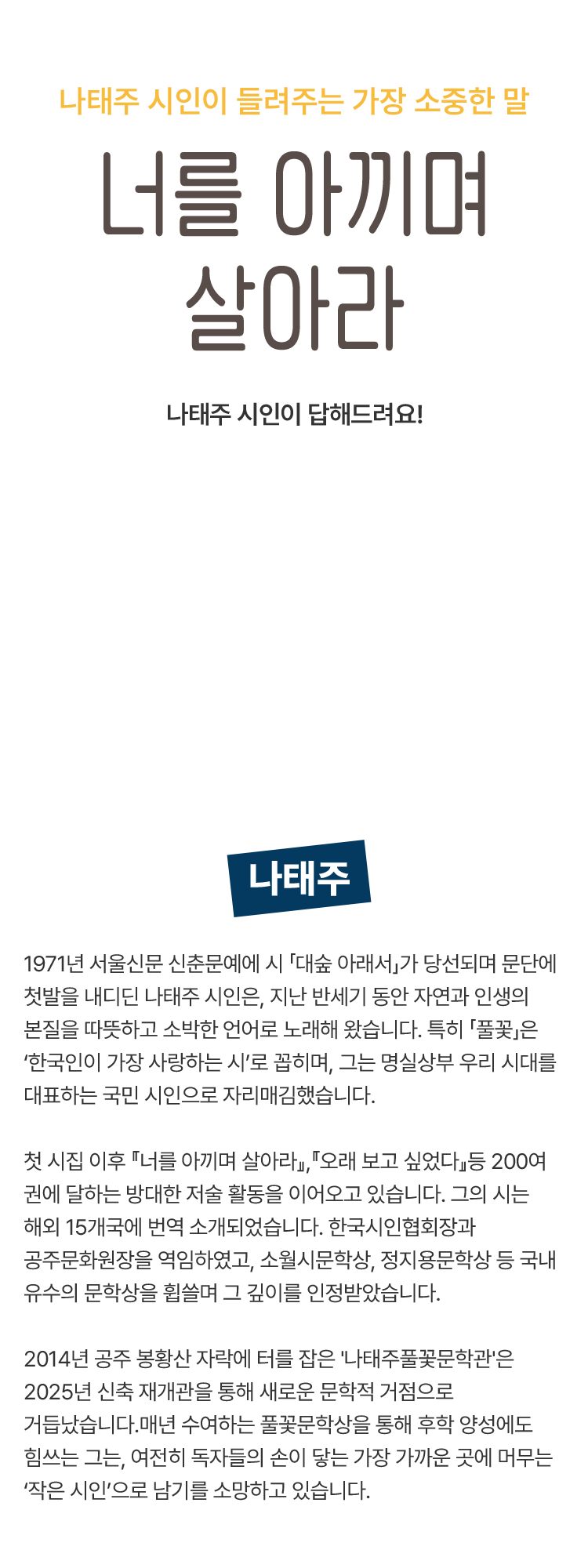 우리 시대의 큰 어른인 풀꽃 시인 나태주가 강연을 준비하며 틈틈이 메모해 둔 노트에서 가장 많은 사람들에게 공감과 감동을 주었던 글귀들을 가려 뽑아 엮은 책. 시인은 작고 평범한 일상을 성실히 가꿔가는 삶이 가장 귀하고 아름답다고 말한다. 우리는 모두 행복할 권리가 있고, 또 행복해야 한다고 강조한다. 그것이 우리의 의무이며 우리는 충분히 그럴 자격이 있다고 위로하고 격려한다.