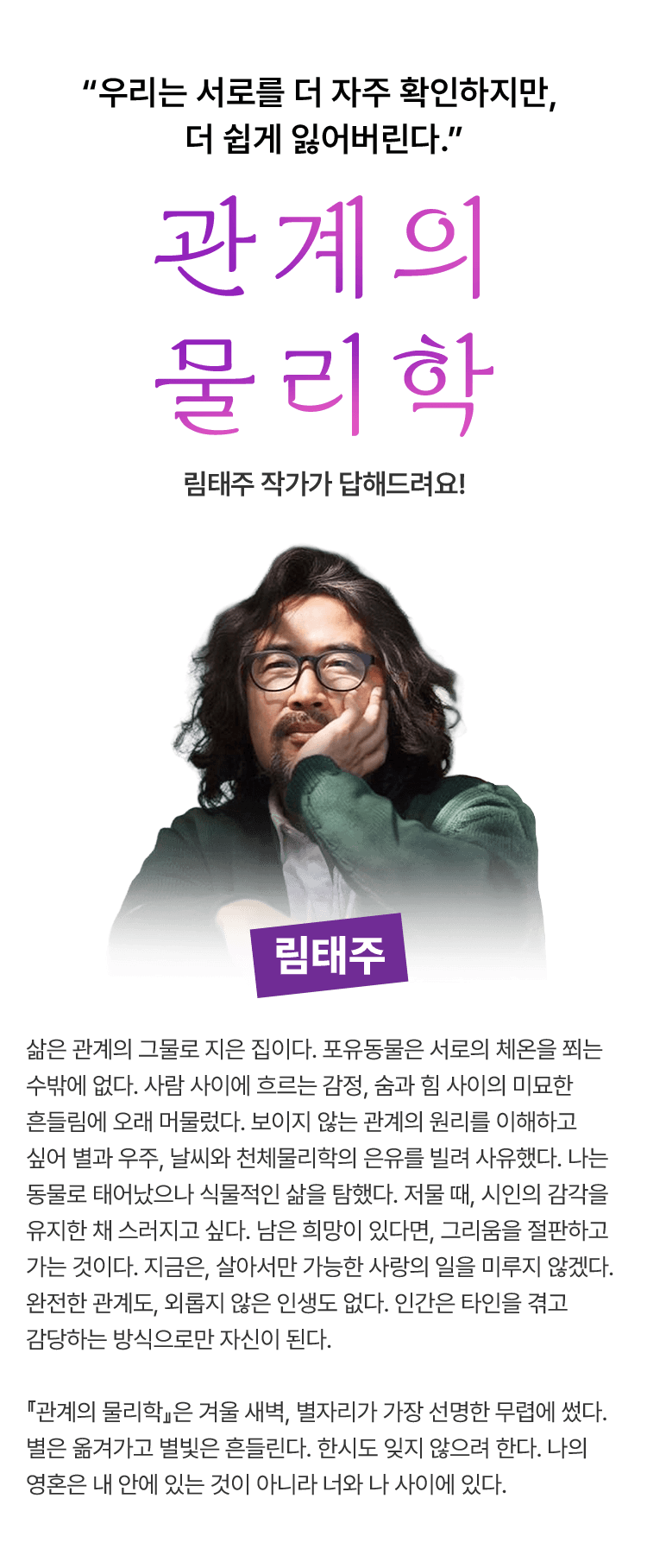 『관계의 물리학』은 사람 사이에 작동하는 보이지 않는 힘을 물리학 개념으로 풀어낸 유니크한 산문집이다. 과학적 정밀함으로 관계를 바라본 후 문학으로 풀어낸 독보적 감성을 지님은 물론, 일상적 사건을 아름다운 은유로 접근해 새롭게 바라보도록 이끈다.