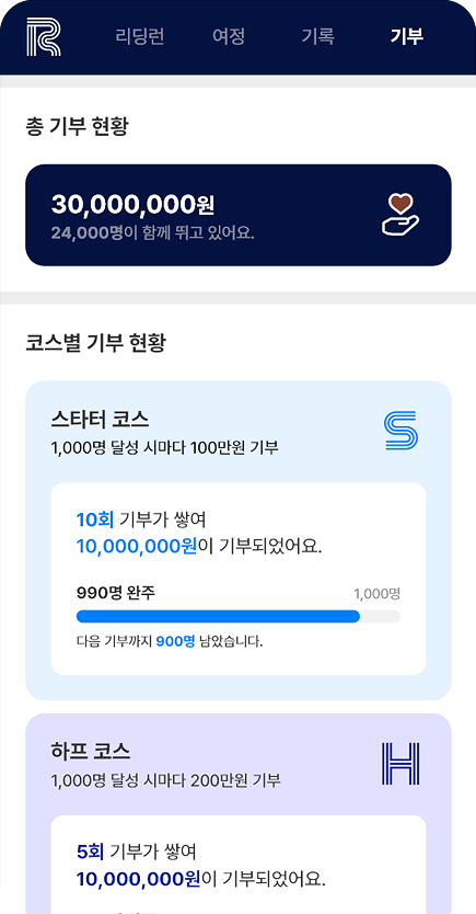 (총 누적 기부금과 기부처는 리딩런 완료 후 별도 안내 예정)